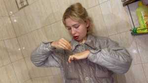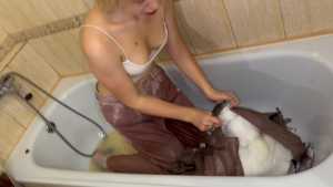 Wetlook in Tight Dress and No Bra! Pantyhose and Wet Feet!
