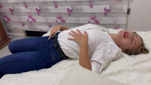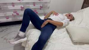 First, I play sexy on the bed! Then I get excited and go get wet in the mini pool! In a sheer shirt without a bra, skinny jeans, and sneakers! And I play with my pussy!