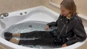 Wetlook in the Lake! Leather Jacket, Jeans and Tights!