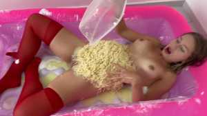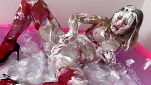 Oh yeaaah! I love it! First, I dip my face in shaving foam! And then I sit on it! I'm completely covered in shaving foam! And I sweetly masturbate my wet, aroused pussy!