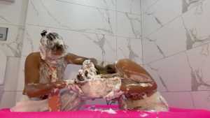 I got really dirty! I sat on pies with my bare pussy and ass! I got pies in my face! And chocolate pudding on my head! In a white shiny dress, and then I passionately jerked off in this mess!