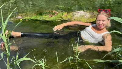 Wetlook in the Lake! Tight Dress, Boots and Pantyhose!
